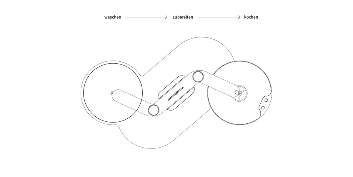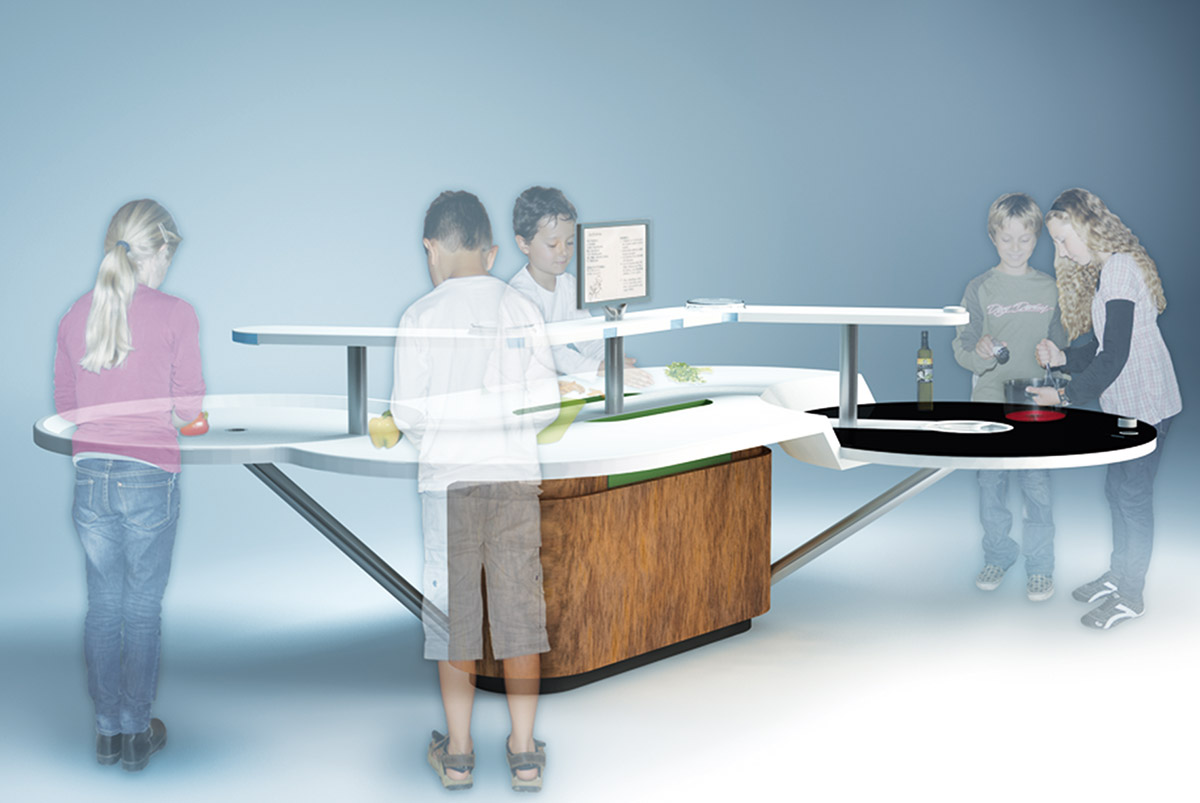 Wie werden wir uns in Zukunft ernähren? Wie und wo lernen Kinder das Kochen? Was kann ein Bewusstsein für gesunde Nahrungsmittel bewirken? Kinder sind keine kleinen Erwachsenen! Sie verhalten sich anders, haben andere Proportionen, Kräfte und Konzentrationskapazitäten. Der Entwurf dieser Kochinsel nimmt darauf mit seiner Form und seinen Funktionen besonders Rücksicht.
