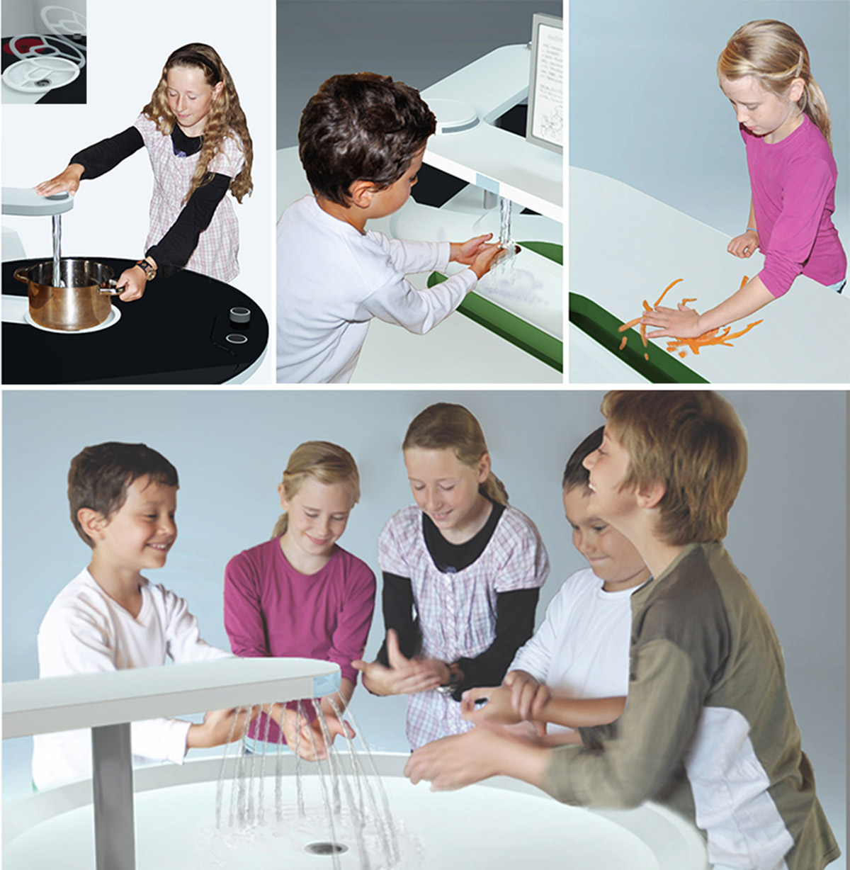 Incito ist eine höhenverstellbare Kochinsel, die an Größen, Proportionen, Kräfte und das Verhalten von Kindern im Grundschulalter angepasst ist. Durch Gruppenarbeit soll sie Spaß am Kochen vermitteln und die Fähigkeiten der Kinder fördern, indem sie die vielen Tätigkeiten in einer Küche leicht macht: Das großzügige Waschbecken bietet platz zum Obst-, Gemüse- oder auch Händewaschen. Biomüll verschwindet einfach und sauber durch einen Schlitz in einer Schublade. Hände oder Utensilien können jederzeit zwischendurch an 4 Wasserstellen in der Mitte des Tisches abgespült werden. Der Herd hat eine angemessene Höhe und Fläche. Beim Abwiegen und Zubereiten ist das Rezept stets im Blick. Der Topf kann ohne Anheben mit Wasser befüllt werden. Der Herd hat eine angemessene Höhe