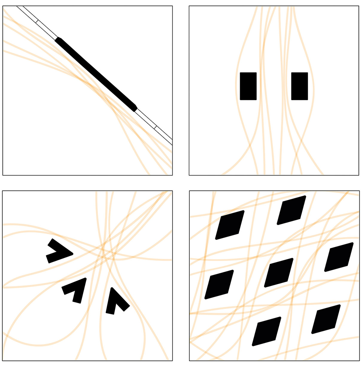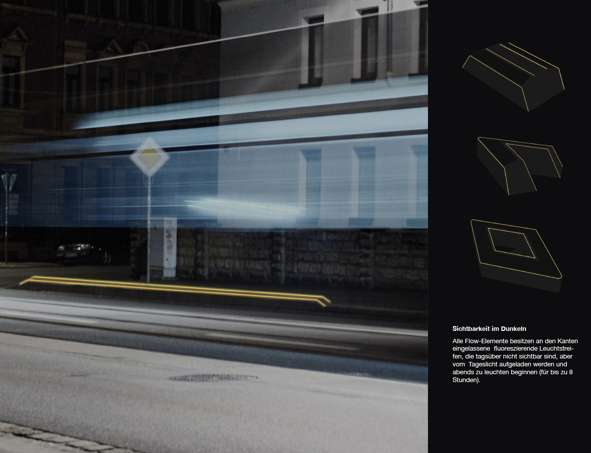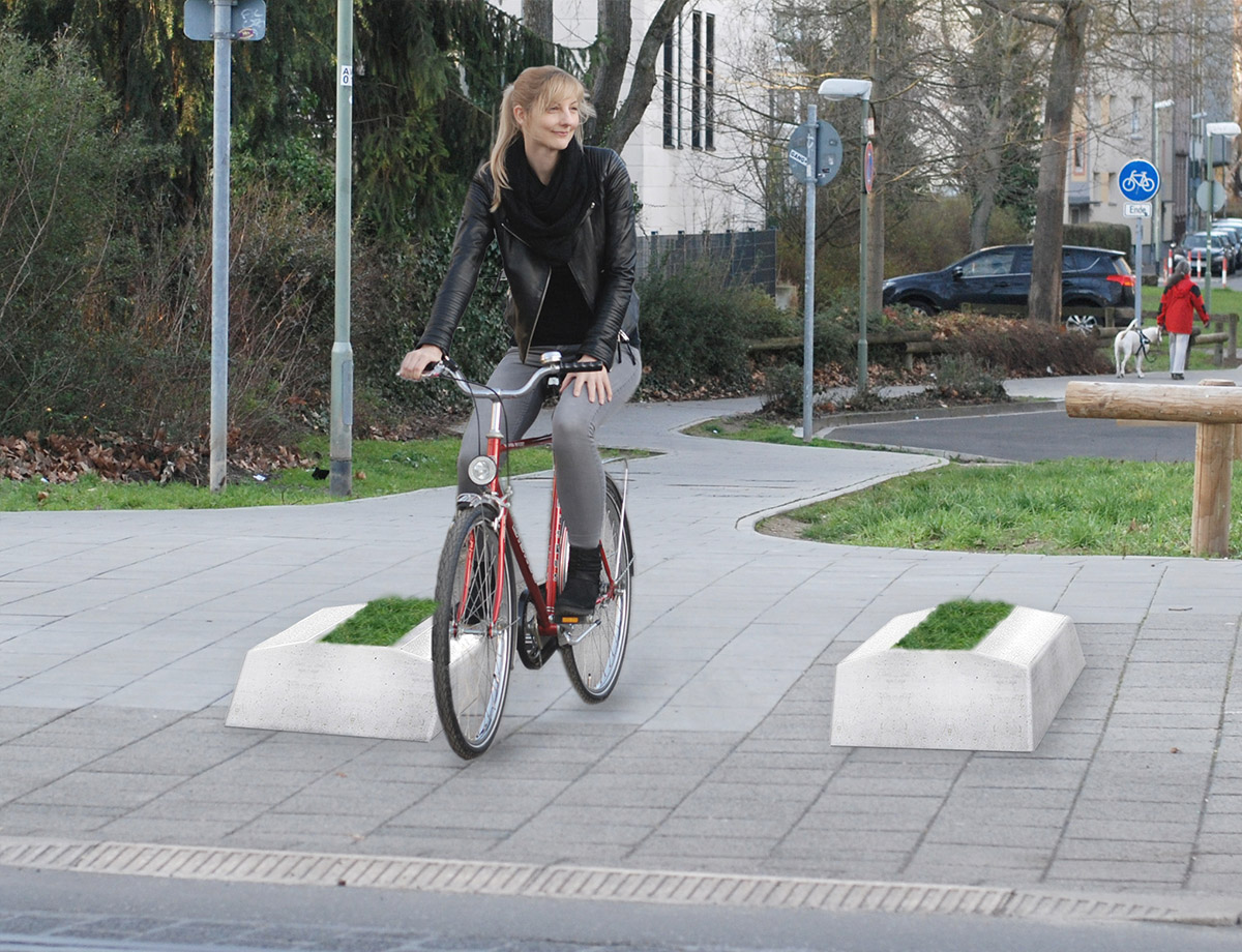 Zusätzlich zum Flow-Bordstein C1 gibt es frei platzierbare Elemente (C2, C3), die besonders für Verkehrsinseln, Straßenübergänge und öffentliche Plätze geeignet sind. Sie sturkturieren und organisieren den Rad- und Fußgängerverkehr nicht nur, sondern erzeugen sogar kleine Choreografien. Außerdem können sie z.B. durch Bepflanzung ihrer Umgebung angepasst werden. Auch Informationen eines Leitsystems könnten hier Platz finden.